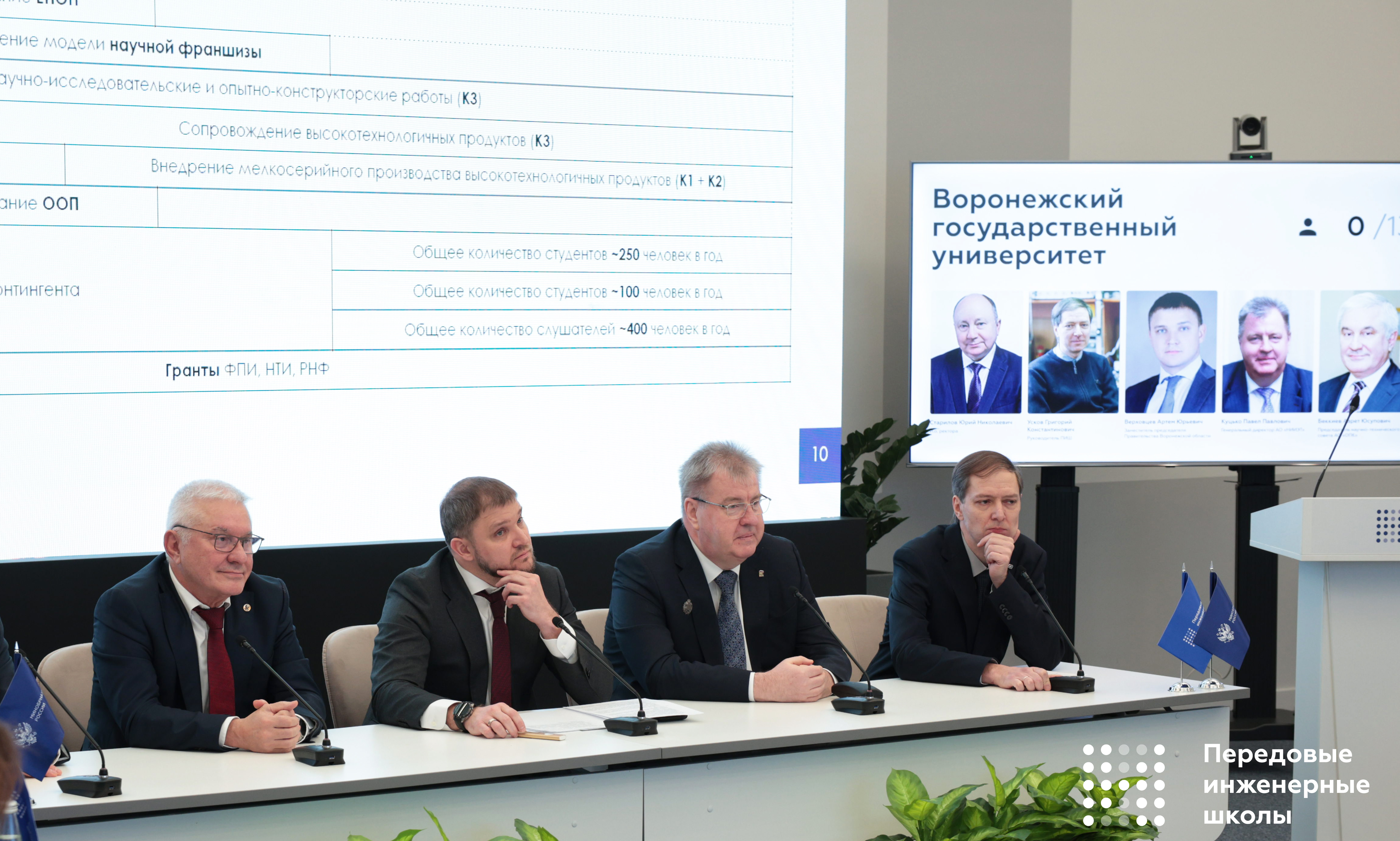 Состав делегации Воронежского государственного университета: заместитель председателя Правительства Воронежской области Артём Юрьевич Верховцев; председатель научно-технического совета АО «Объединённая приборостроительная корпорация», член-корреспондент РАН Азрет Юсупович Беккиев; генеральный директор АО «Научно-исследовательский институт электронной техники» (входит в ГК «Элемент», MOEX:ELMT) Павел Павлович Куцько; исполняющий обязанности ректора ВГУ Юрий Николаевич Старилов; исполняющий обязанности проректора по науке, инновациям и цифровизации ВГУ Дмитрий Владимирович Костин; руководитель ПИШ ВГУ Григорий Константинович Усков.